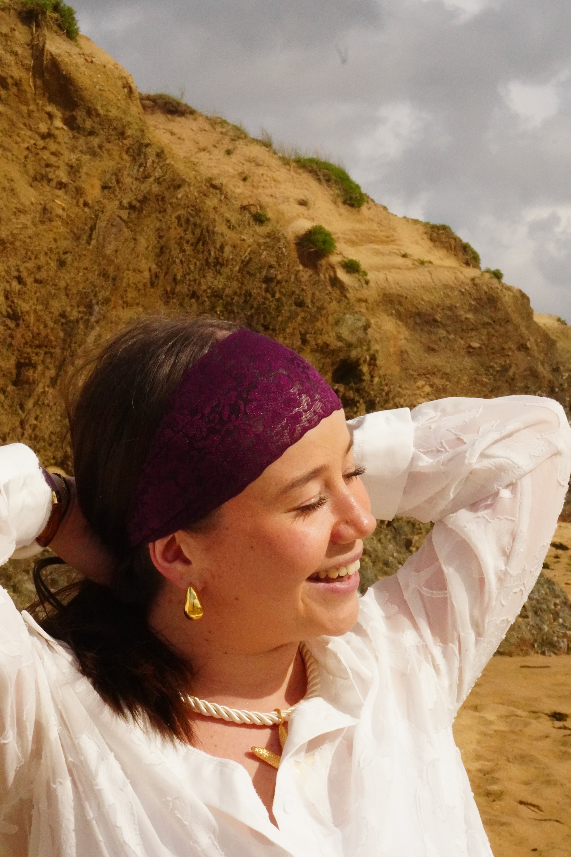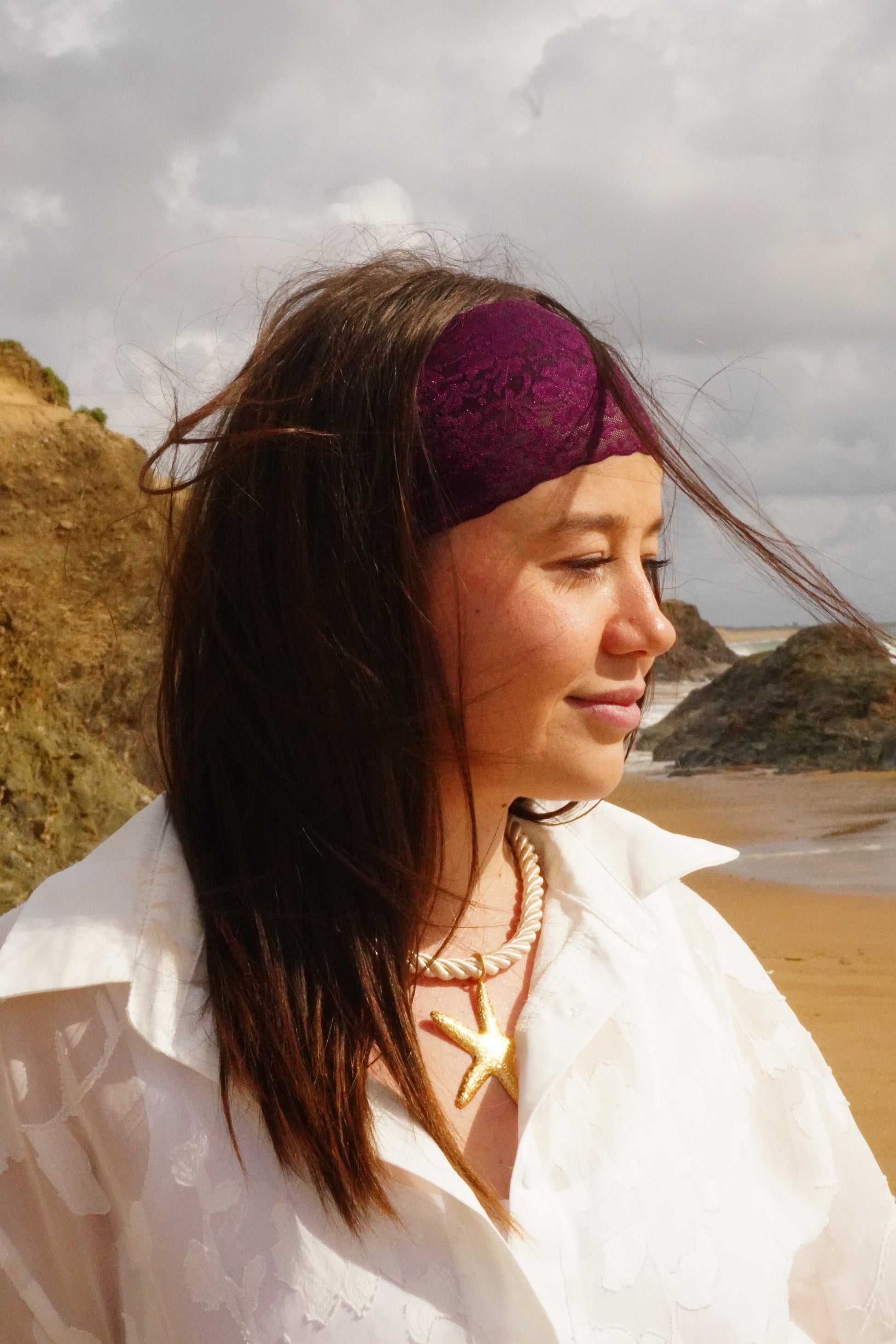 Ajoutez une touche de charme à vos coiffures avec le bandeau Carla, confectionné à la main, en dentelle prune achetée en mercerie.