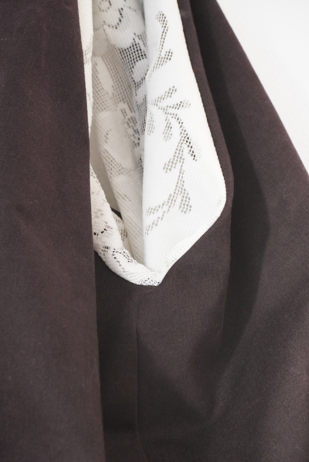 Confectionné à partir d’un rideau en dentelle, il révèle tout le charme du travail textile d’antan.